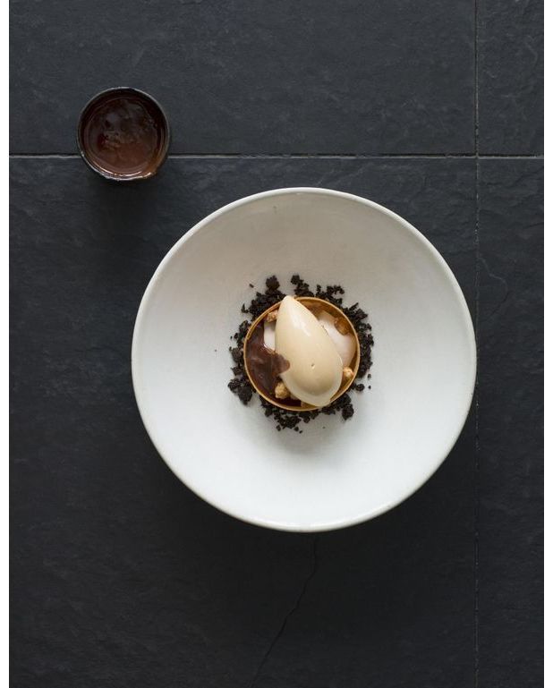 Remplissez les fonds de tarte de ganache, arrosez de sauce chocolat, posez sur chaque tarte une quenelle de glace caramel, parsemez le tout de praliné et de cacahuètes et servez.