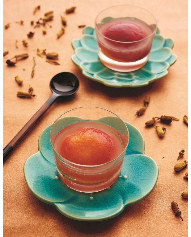 Filtrez le jus de poire réduit et mélangez-le au reste du jus. Ajoutez le mirin. Portez à ébullition et laissez frémir 2 mn. Versez ce jus sur les pêches. Placez les coupelles au réfrigérateur 3 h.