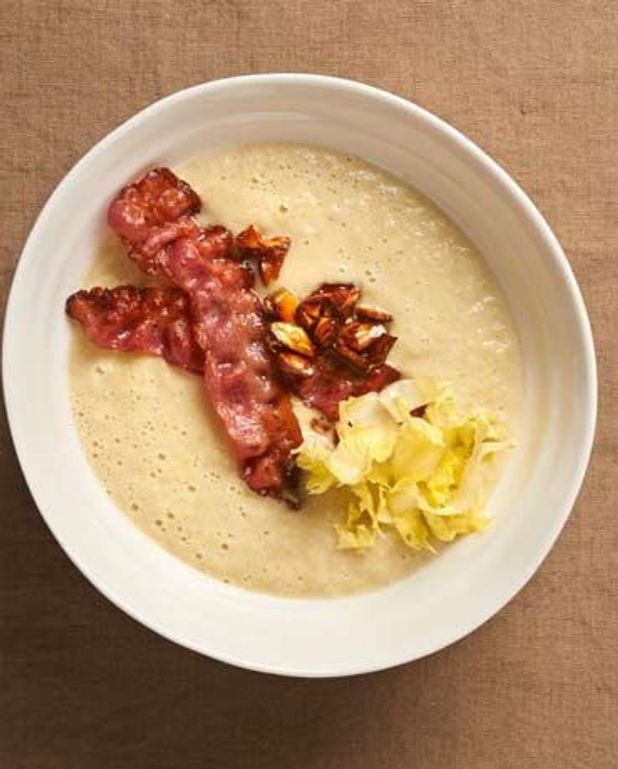 Faites fondre le beurre dans une sauteuse et faites-y blondir les échalotes. Ajoutez les endives hachées, quelques pincées de sel et de sucre et laissez caraméliser. Versez 1/2 litre d’eau et émiettez le cube de bouillon. Dès l’ébullition, comptez 30 mn de cuisson. 3. Versez le sucre dans une casserole et ajoutez 1/2 cuil. à café de sel ; laissez cuire jusqu’à obtention d’un caramel blond. Ajoutez les amandes, mélangez puis versez la préparation sur une feuille de papier sulfurisé. Laissez refroidir puis brisez en petits morceaux. . Faites dorer les tranches de lard dans une poêle antiadhésive, sur les deux faces, puis épongez-les sur un papier absorbant. Emincez les coeurs d’endive et ajoutez l’huile d’olive ; mélangez bien.. Mixez les endives cuites en incorporant la crème. Salez et poivrez si nécessaire puis répartissez dans quatre bols. Garnissez des tranches de lard, parsemez d’amandes au caramel et ajoutez les endives crues. Servez aussitôt.